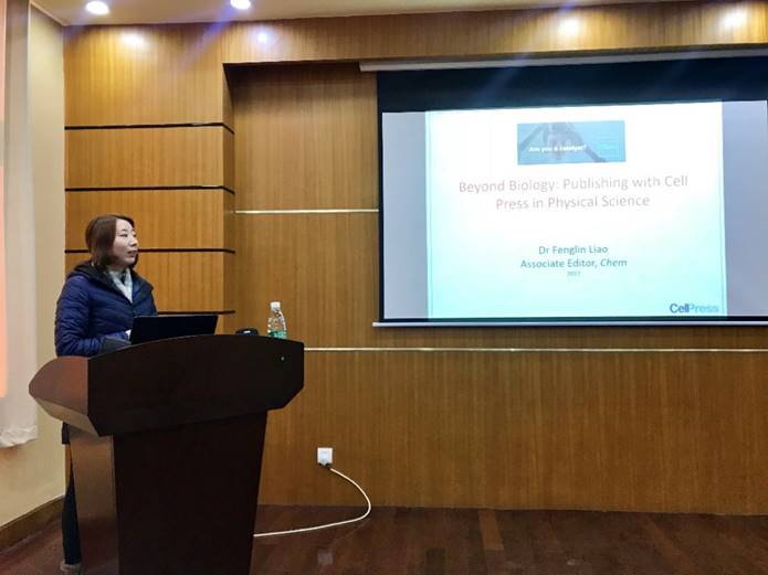 开展学术交流,并为广大师生作了题为“Beyond Biology: Publishing with Cell Press in Physical Science”的讲座报告。报告会由杨化桂教授主持,来自材料学院、化学院、药学院等相关研究领域的师生参加了学术报告会。