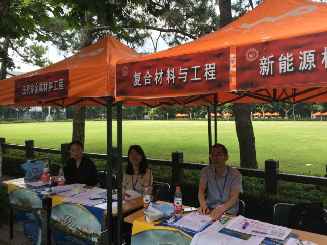 招生咨询会如火如荼地召开了。大草坪两旁林荫大道的各专业咨询台吸引了众多家长和高考学子们。材料学院副院长李欣欣、专业责任教授顾金楼和朱以华、无机系系主任曾惠丹、高分子系系主任周权和学院办公室主任顾婷都来到咨询会现场,悉心地为高考学子和家长们做着解答。