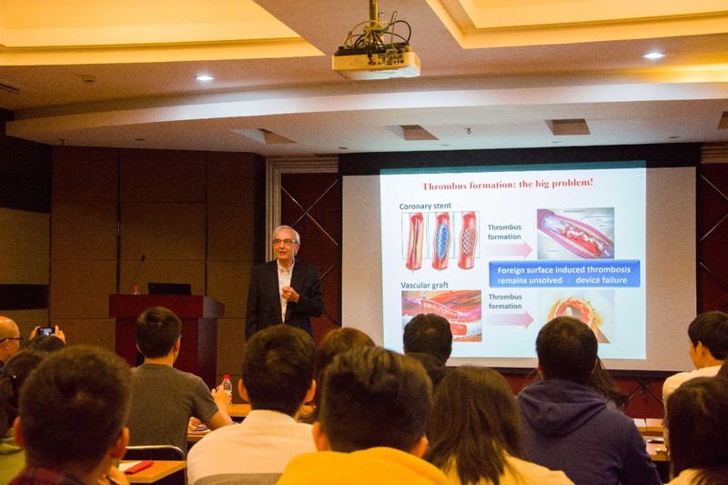 报告中,Brash教授介绍了用于血管移植物、冠状动脉支架和人工心脏瓣膜等血管相容材料的研究工作。Brash教授课题组深入研究材料-血液界面上蛋白的吸附行为,控制蛋白-表面之间相互作用,阻止非特异性蛋白(即材料获得生物相容性的“敌人”)与血液或组织之间相互作用,促进有利于抗菌、抗炎或者抗血栓形成的“good”蛋白在表面吸附,提高材料的生物活性。根据上述深入的机理研究,Brash教授分别构建出可抗蛋白吸附的聚环氧乙烷—聚氨酯共混体系、抗凝血的表面以及可溶解凝血血块的表面。