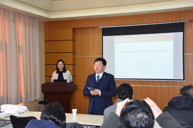 1月17日下午,《Nature Nanotechnology》副主编Dr. Wenjie Sun受邀来校访问,并作了题为“Publishing in Nature journals:An insider’s view of Nature journals”的精彩报告。报告由副校长刘昌胜院士主持,材料学院李永生教授、顾金楼教授、屈雪教授、王靖教授,刘润辉教授等师生共同参加了报告会。