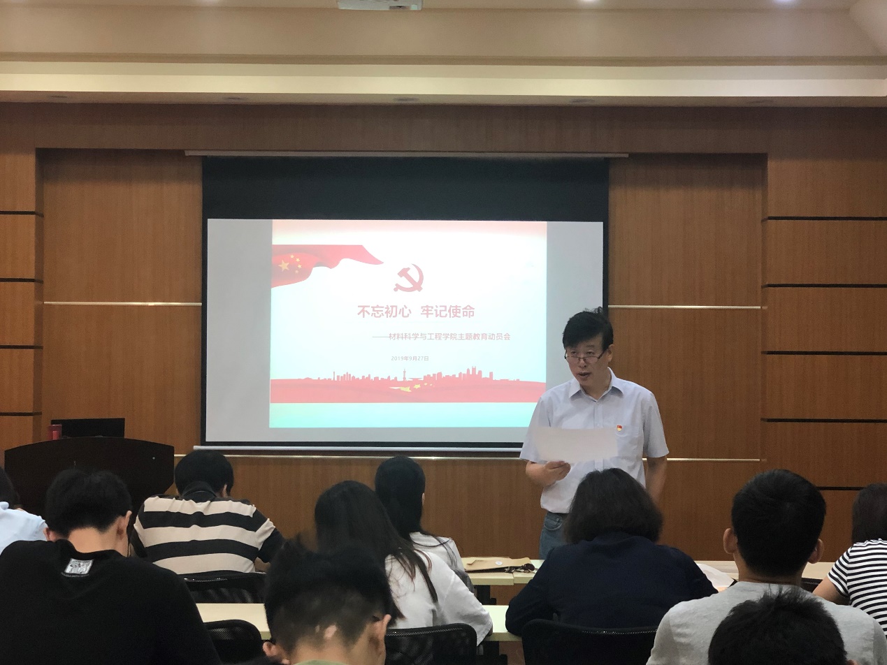 9月27日下午,材料学院召开“不忘初心、牢记使命”主题教育动员部署会,对学院开展主题教育进行全面动员与重点部署。学院党委书记唐颂超教授、组织员、全体教工和学生党支部书记参加了会议。