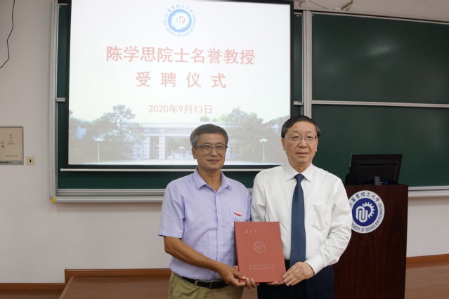 访问,受聘为学校名誉教授并作学术报告。受聘仪式在徐汇校区第三教学楼201室举行,副校长钱锋院士出席受聘仪式并为陈学思院士颁发聘书、佩戴校徽。仪式由材料学院院长林绍梁主持,化学与分子工程学院田禾院士,图书馆馆长、材料学院学术委员会主任林嘉平,国际合作与交流处处长李永生,材料学院党委副书记李欣欣等师生代表近100余人生参加了受聘仪式。