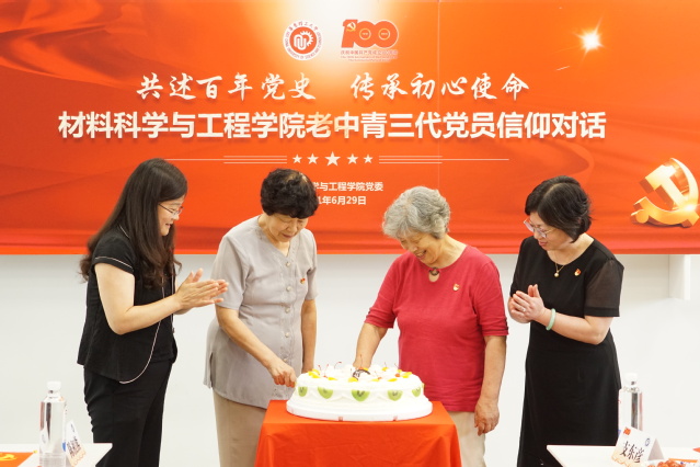夏江雯、王惠文、张雪芹、徐永桢和材料学院的党政领导班子成员为“政治生日”寿星颁发“政治生日”贺卡。