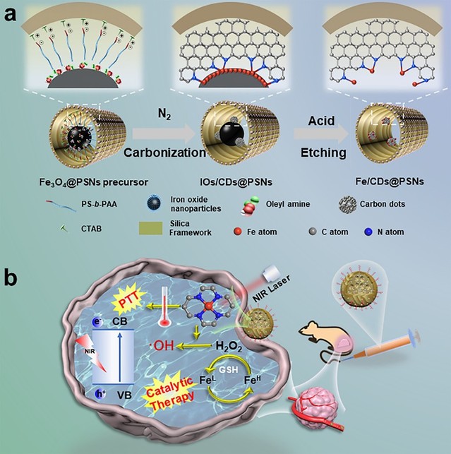 相较于大量关于碳基单原子体系在工业催化领域的研究,面向生物应用的单原子材料的构建仍处于起步阶段。因此,发展高效的生物用单原子体系在生物医药领域具有重大的临床应用潜力。基于此,本工作提出了一种简便通用的“界面限域配位”策略,在具有良好生物相容性的双介孔二氧化硅孔道内构建金属单原子纳米治疗剂用于肿瘤的高效安全治疗。利用多孔氧化硅纳米反应器中的孔道限域效应,通过原位高温碳化嵌段共聚物(聚苯乙烯-b-聚丙烯酸/PS-b-PAA)和含氮小分子(十六烷基三甲基溴化铵/CTAB和油胺)形成氮掺杂的碳点、再借助碳点与氧化铁纳米颗粒界面处的Fe-N-C配位作用及后续的酸刻蚀技术,实现硅基Fe 单原子纳米治疗剂的可控精准构筑。基于受限介孔孔道中独特的Fe-N-C单原子结构,该硅基 Fe 单原子纳米治疗剂在外源性近红外光辐照下具有高效的光热转换能力,其光热转换效率可达58.1%,是传统碳基光热试剂(不含单原子结构)的3倍之多。DFT计算进一步揭示了孔道限域环境下单原子结构增强碳基材料光热性能的内在机制,主要源于孔道内单原子锚定的缺陷碳结构中电子密度增加、带隙减小。此外,孔道中的Fe单原子结构还具有pH/GSH双触发的肿瘤微环境响应催化治疗能力,即可将内源性双氧水转化为羟基自由基来杀伤肿瘤细胞,并在细胞和活体层面分别论证了该硅基 Fe 单原子纳米治疗剂在高效肿瘤光热/催化治疗方面的应用潜力。该工作将为设计和精准构建具有可调变金属成分的多功能单原子纳米治疗剂以实现安全有效的肿瘤治疗提供了新的思路和科学指导。