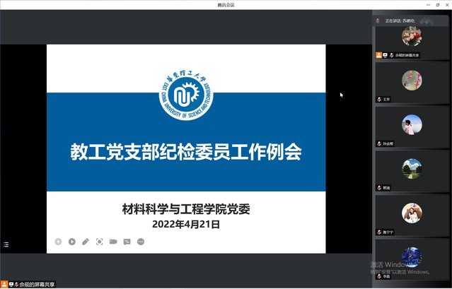 最后,结合当前疫情防控形势,与会人员分享了纪检委员冲锋在前、坚守在疫情防控一线的动人故事。张雪薇老师第一时间进驻徐汇校区,默默地守护着校园;李宇航老师协同超细党支部成立计算机网络小分队,为学院研究生招生工作保驾护航;李星玮老师作为“学业帮扶团”教师志愿者,助力学风建设;何宏燕老师收到梅陇四村退休老师的求助后,热心尽力,积极协调解决老师生活困难;管涌老师积极参与党员先锋岗工作,通过“一对一结对”关心关爱学生;杨婷老师在研究生复试工作中带头履行纪检委员监督职责,把工作做实做细;孙金煜老师积极建言献策,为研究生复试工作提供“方案智囊”;李晶老师时刻在线,处理研究生信息统计、健康打卡和应急联络工作;钱秀珍、王芳老师积极参与社区志愿服务,诠释奉献精神。