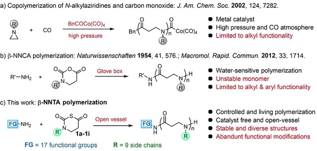 天然多肽具有重要生物学功能,但结构不稳定和易被蛋白酶水解等缺点限制多肽的功能和应用,多肽模拟物可以针对性地应对这一挑战,因而在药物发现、组织工程等诸多领域具有重要应用。前期,刘润辉教授课题组建立了对水分不敏感的β-NTA(β-氨基酸N-硫代羧基酸酐)聚合新方法,解决了β-内酰胺聚合制备β多肽这一经典合成方法对水分敏感、聚合条件苛刻、功能基团受限的核心挑战(Angew. Chem. Int. Ed. 2020, 59, 7240-7244)。
