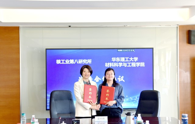 图片说明:中核八所党委副书记、纪委书记、工会主席周莉与材料学院党委书记袁媛签署战略合作协议