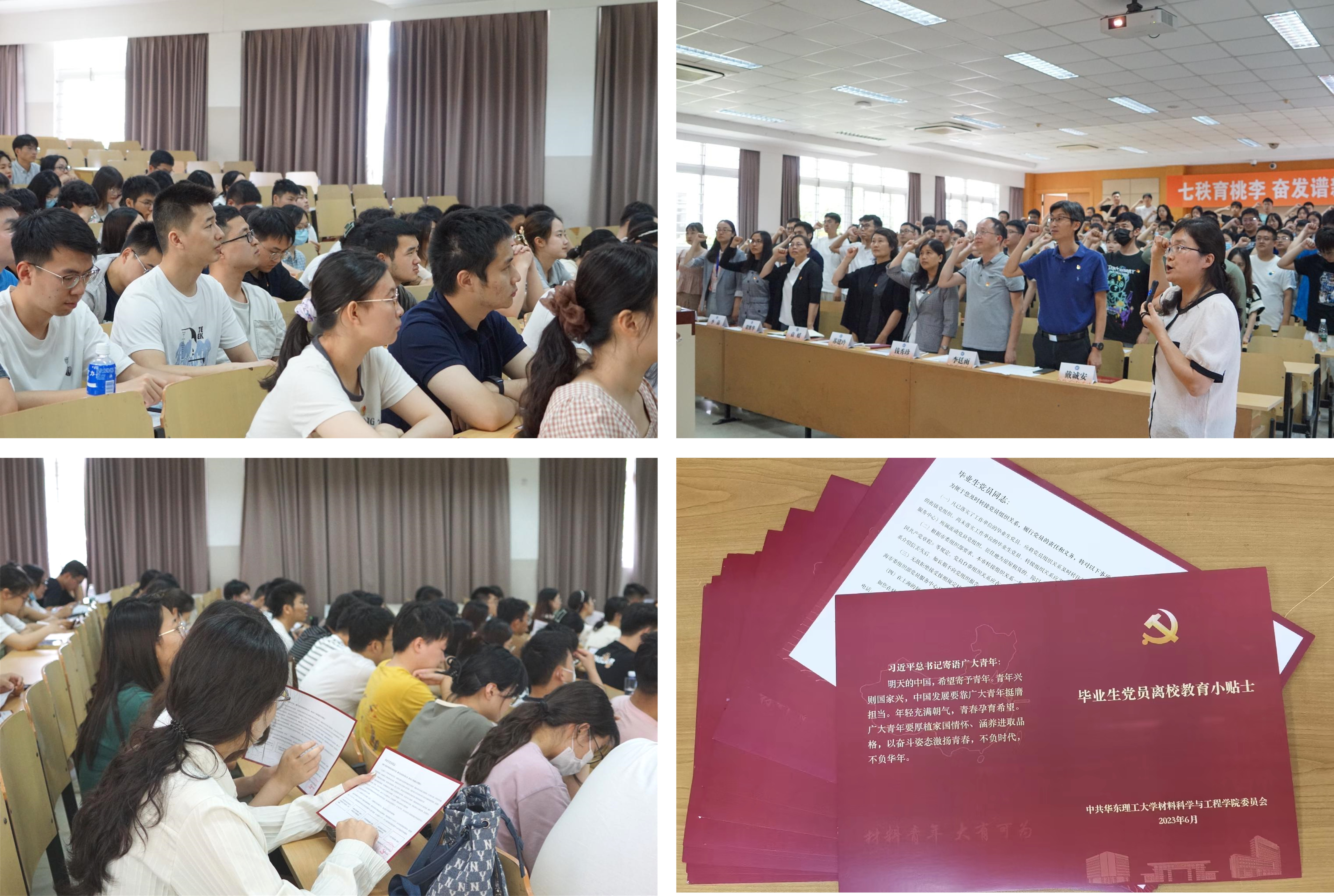 在徐汇校区八教107召开2023届毕业生党员离校教育大会。材料学院党委书记袁媛、党委副书记兼纪委书记苏建玲、党委副书记戴诚安、专职组织员、本研辅导员、党建兼职辅导员及全体毕业生党员参会。会议由戴诚安主持。