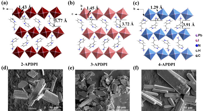 研究团队在前期钙钛矿材料结晶行为和结构调控的基础上,创新性地引入具有不同取代位的芳香二胺配体,设计合成了一系列同构的新型二维芳香Dion-Jacobson型钙钛矿光催化材料,即(2-(2-氨基乙基)吡啶)PbI4(2-APDPI),(3-(2-氨基乙基)吡啶)PbI4(3-APDPI),和(4-(2-氨基乙基)吡啶)PbI4(4-APDPI)。其中2-APDPI和4-APDPI结晶于极性空间群,压电常数(d33)约为40 pm V−1,而3-APDPI则结晶于中心对称空间群。