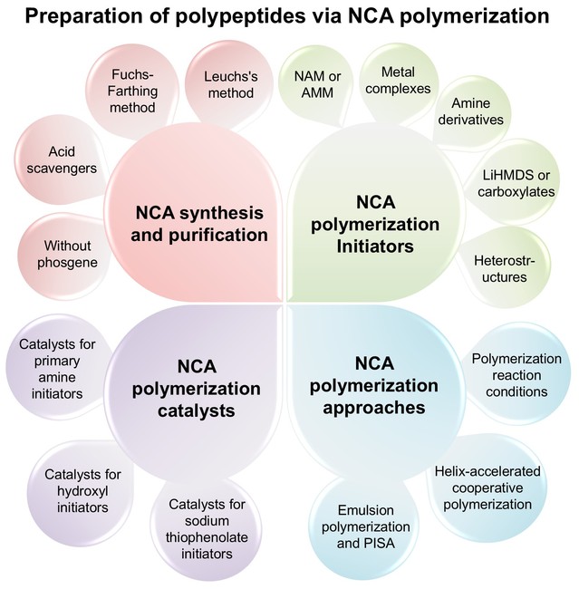 基于课题组对氨基酸聚合物合成领域的深入研究与系统认知,本篇论文凝练总结了NCA聚合策略的最新进展。涵盖了NCA单体的合成方法及其优缺点;深入探讨了多种NCA开环聚合的引发剂;同时分析了不同NCA聚合催化剂在提高聚合速率和可控性方面的作用;凝练了NCA聚合方式的最新研究进展,包括聚合反应条件、螺旋加速协同聚合和聚合诱导自组装(PISA)的应用等;并基于课题组在本领域的长期研积累和体会对氨基酸聚合物未来研究和应用方向进行了展望。