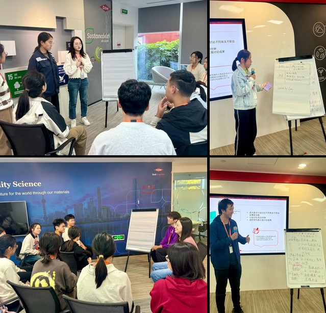 活动的最后,陶氏公司各部门专家以志愿者的身份,加入同学们的四个小组,一起围绕“学校与职场的区别”、“职业思维与学生思维”、“工作需要的能力和技能”以及“我们如何为求职做准备”四个话题,展开了激烈的讨论。同学们在踊跃表达自己对于未来职业生涯的想法与疑问的同时,也聆听陶氏公司志愿者们的分享,现场气氛轻松活跃。各个小组派出各自的代表做出了相应的总结分享。
