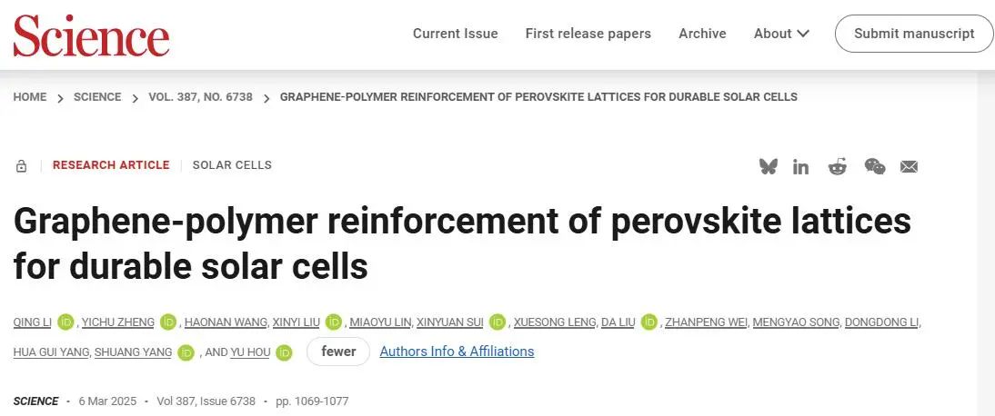 材料学院清洁能源材料与器件团队侯宇教授、杨双教授等人在Science(《科学》)发表题为“Graphene-polymer reinforcement of perovskite lattices for durable solar cells”的最新研究成果。该研究发现了钙钛矿光伏不稳定性的关键机制——光机械诱导分解效应,提出石墨烯-聚合物机械增强钙钛矿材料的新方法,制备的太阳能电池器件在标准太阳光照及高温下的T97工作寿命创下3670小时新纪录,该研究成果将为钙钛矿太阳电池的产业化应用提供全新解决方案。