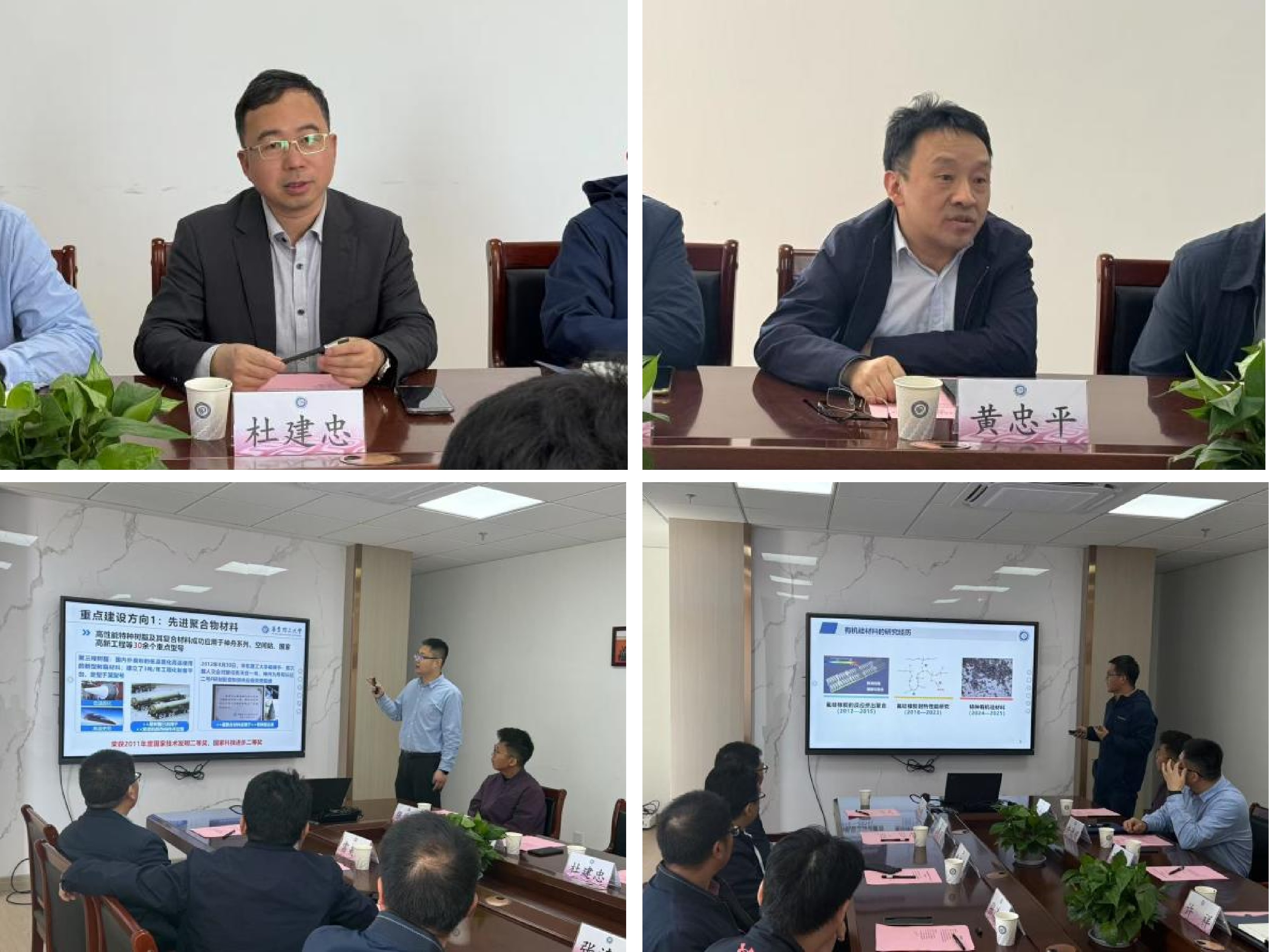 杜建忠对黄忠平一行的到访表示热烈欢迎,并介绍了材料学院在有机硅领域的研究基础,重点交流了在耐高温树脂方面的研究成果。他表示,学院高度重视此次项目交流,将全力推动资源高效整合,支持关键技术联合攻关的开展。