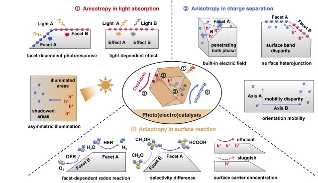 图2 光(电)催化中的各向异性机制示意图。各向异性单晶半导体相关的光催化氧化还原反应的示意图。①光吸收, ②载流子分离, ③表面氧化还原反应。