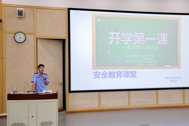 褚轶琛为学生讲授“象牙塔中说防范”防诈骗安全教育课,结合真实案例,剖析了常见诈骗手段的特点和防范技巧。他列举了系列市内高校的大金额诈骗案例,对报警后遇到的破案难、财产难以追回等情况进行分析,敲响了防诈骗的警钟。随后讲述了冒充公检法、好友、导师等熟人的作案手段,其中违规办理电动车牌照被骗的实例引起学生关注,通过这些案例,帮助学生识别各类骗局,切实保护自身生命安全和财产安全。