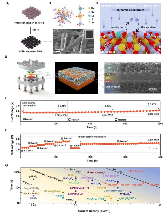 该研究创新性地在PEMWE实际运行条件下实现了非贵金属催化剂的动态平衡机制,为设计下一代高性能、低成本、长寿命的PEMWE阳极材料提供了新思路,对降低制氢成本、推动绿氢产业发展具有重要意义。