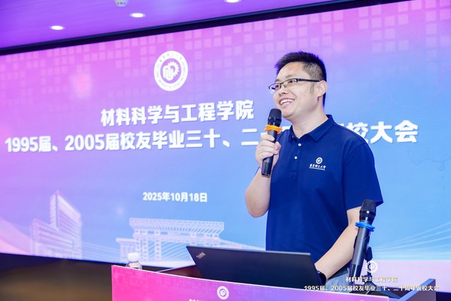 在校友代表发言环节,复材910班,核工业第八研究所总工程师、副所长徐哲军围绕“感悟、感谢、祝福”三个关键词交流,由衷感谢母校的培养,他谈到,华理为行业输送了大量专业人才,结合自身工作实践,就材料学科发展如何顺应时代变革交流了见解。材911班,度亘核芯光电技术(苏州)股份有限公司总裁张艳春回顾了在华理的求学时光,高度认同学校注重学生全面发展的育人理念,结合个人职业成长经历,他指出材料领域创新空间广阔,呼吁广大校友将个人成长与学校学院发展紧密融合。高材014班,上海芳瑜新材料科技有限公司总经理韩晓波,结合屏幕上的两张合影,以“三个心愿”为主线,分享了重返母校的感悟与个人发展历程,他表示将始终铭记投身材料行业的初心,以踏实的心态做好每一件事。无材011班,上海大学教授杨光深情回忆了在华理的学习与科研岁月,他谈到,毕业后与校友合作倍感亲切,彼此间深厚的信任感正是母校所赋予的宝贵财富。