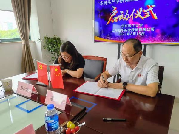 2021年8月18日,华东理工大学与上海强华实业股份有限公司本科生产学研实践基地签约及揭牌仪式成功举行,漕泾镇党委书记陈立俊、漕泾镇副镇长王红亮、漕泾工业区总经理李礼、强华股份总经理周文华、强华股份战略决策咨询顾问韩宝富、强华股份Etch项目负责人周韦军,华东理工材料学院党委书记袁媛、无机材料系主任赵崇军、原系主任王以群等出席了本次仪式。