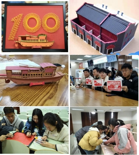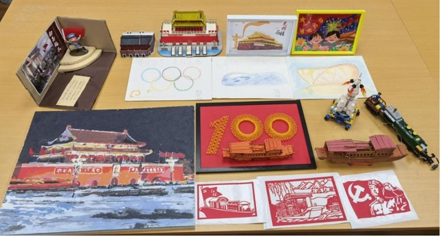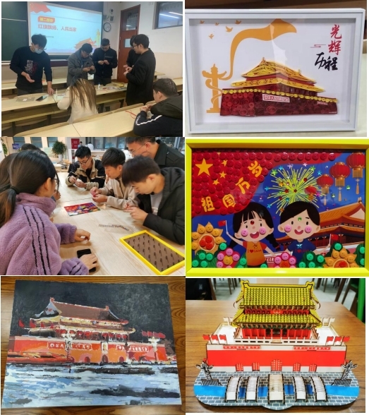 第2组、第3组和第8组选择制作“天安门”衍纸画、模型,“庆祝建党百年”纽扣画等,中华人民共和国中央人民政府成立典礼、“五四运动”、“一二·九运动”都在这里为中国现代革命史留下了浓重的色彩,通过制作红色作品,深入学习中华民族走向伟大复兴的发展历程。