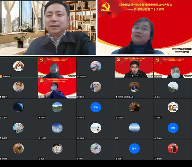 为全面准确领会党的二十大精神,进一步推进党的二十大精神走深走实,12月13日下午,材料学院邀请中国浦东干部学院基层党建研究中心主任、上海市学习贯彻党的二十大精神专家宣讲团成员吴涛教授,作题为《以中国式现代化全面推进中华民族伟大复兴——学习贯彻党的二十大精神》线上辅导报告。学院全体教职员工、部分研究生党员参会,会议由学院党委书记袁媛主持。