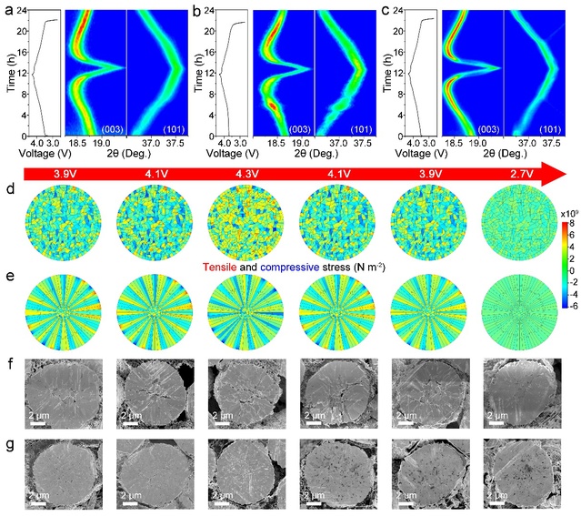 高镍层状正极材料在高重量/体积能量密度方面对下一代锂离子电池(LIBs)具有显著优势,可以更好地满足未来电动汽车轻量化和智能化的要求。然而其充放电过程中的多重相转变,晶格氧逃逸以及界面副反应极大地挑战了电池的热稳定性和安全性。基于上述问题,华东理工大学江浩/李春忠课题组实施原位共沉淀策略以获得新型超分散Nb掺杂的高镍正极材料,该正极材料由细长和径向排列的初级粒子紧密堆积组成,富有更强氧稳定性的(001)平面。其独特的微观结构使晶内和晶间应变分布均匀,球形二次粒子稳定,有效抑制了微裂纹的形成,扩展及表面退化。同时,超分散的Nb掺杂有效防止了Li/Ni的无序化和晶格氧逸出,从而进一步增强了正极材料的晶体结构和热稳定性。这些优势使其在各种速率和工作温度下表现出卓越的电化学性能,并在软包全电池中具有出色的循环寿命。因此,该正极材料在0.1C下具有229.0 mAh g-1的高可逆比容量。在软包全电池中,在3.0-4.2 V范围内,在1C条件下500次循环后容量保持率为91.9%,5C条件下2000次循环后容量保持率为80.5%,表现出超长寿命,满足电动汽车的轻量化和智能化的需求。