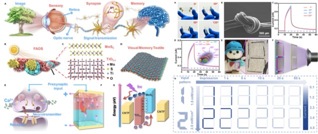可穿戴电子设备作为一种与人类进行近距离互动的新兴平台受到关注,仿生视觉系统具有视觉感知和神经触突样学习/记忆功能,可以满足未来可穿戴电子产品的要求。然而,开发可穿戴视觉记忆系统面临的主要挑战是与不规则表面的几何兼容性和透气性差。基于上述问题,华东理工大学袁双龙课题组提出了一种由直接生长在柔性碳纳米管纤维(CNTF)电极上的高密度TiO2-x和MoS2阵列组成的双扭曲结构的纤维状人工光电突触(FAOS)的设计策略。该FAOS整合了电/光感应能力,实现了多种突触功能,包括受到刺激后电流、短期/长期可塑性以及“学习-遗忘-再学习”行为。所制备的FAOS还显示出良好的灵活性,其光电突触性在弯曲200次后可保持95.95%。由于1D光纤的全向光吸收特性,光线入射角的变化对FAOS的光电突触性能几乎没有影响。作为概念证明,七个FAOS直接编织到商用透气纺织品中,形成光电突触阵列,从而实现了可感知和记忆图像信息的可穿戴织物,展示了其在可穿戴视觉记忆系统中的应用。