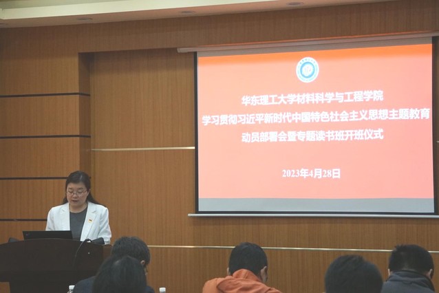 4月28日上午,材料科学与工程学院在实验一楼第一会议室召开学习贯彻习近平新时代中国特色社会主义思想主题教育动员部署会暨专题读书班开班仪式,深入学习贯彻习近平总书记在中央主题教育工作会议上的重要讲话精神。校党委常委、副校长朱为宏,校党委组织部干部监督室主任、第五联络组联络员范圣法,材料学院党委书记袁媛,党委副书记兼纪委书记苏建玲,副院长胡彦杰、顾金楼、江浩及党支部书记、内设机构负责人、师生代表等40余人参会。