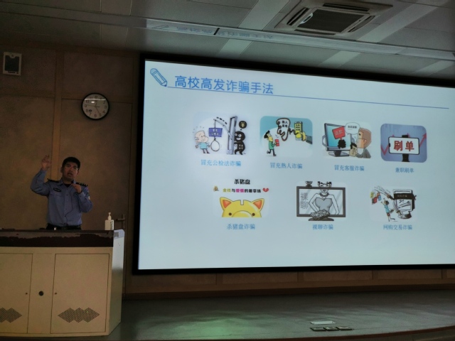 褚轶琛警官做了“高校反诈”宣传课,生动分析杀猪盘诈骗、冒充公检法诈骗、冒充熟人诈骗、冒充客服诈骗、兼职刷单、裸聊诈骗、网购交易诈骗等七类高校高发诈骗类型,并给出“六个一律”和“八个一律”反诈必杀技。褚警官深入浅出的讲解,提升了学生对各类诈骗的认识以及警惕心理。