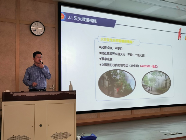 保卫处段凯洋主讲,学院党委副书记戴诚安、徐汇校区全体研究生班长、党支部书记、心理委员、学生党员、入党积极分子等200多名研究生参加。研究生辅导员李晶主持。