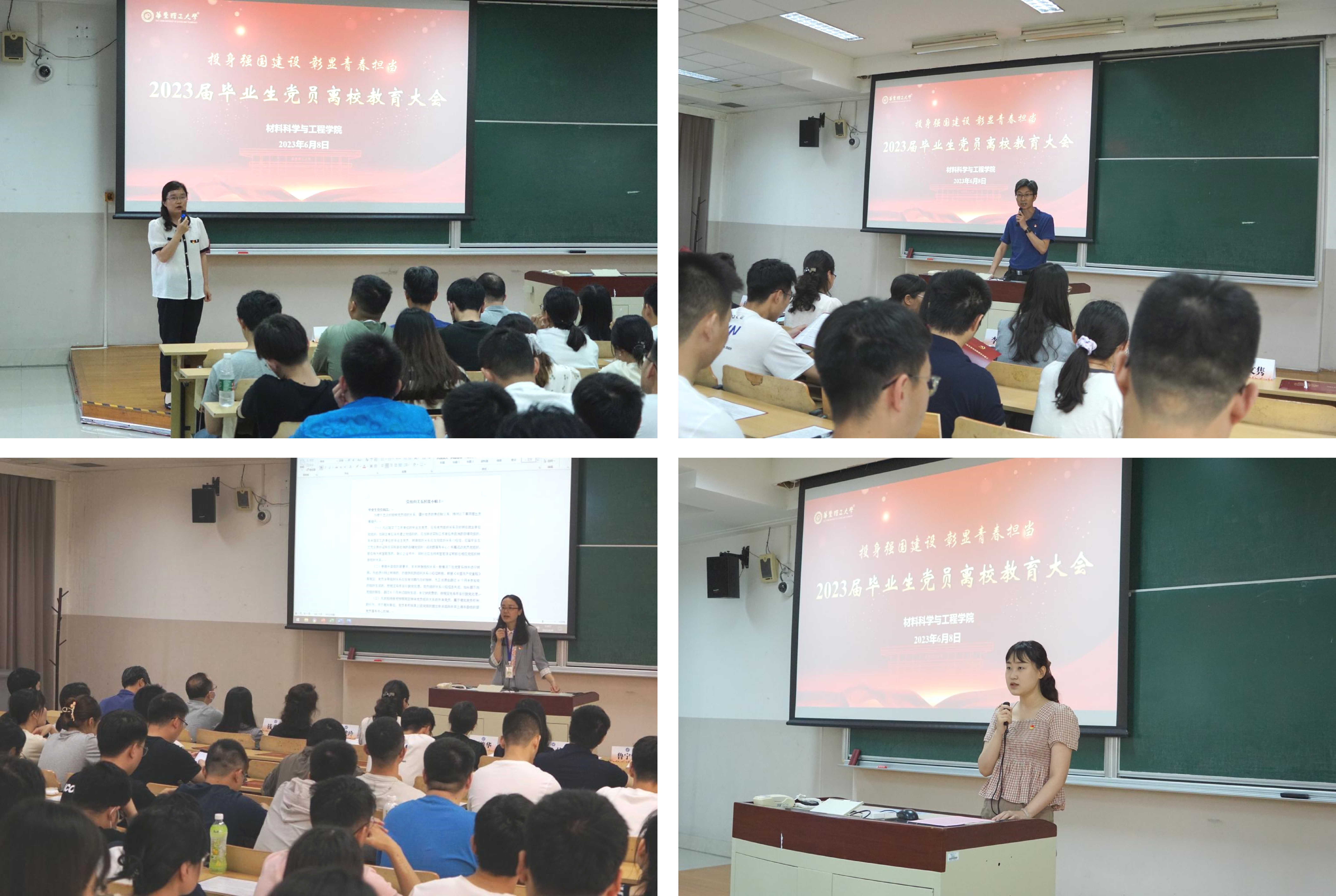 为深入开展学习贯彻习近平新时代中国特色社会主义思想主题教育,引导和鼓励毕业生党员坚定理想信念,以良好的精神风貌踏入新的征程,6月8日中午,材料科学与工程学院在徐汇校区八教107召开2023届毕业生党员离校教育大会。材料学院党委书记袁媛、党委副书记兼纪委书记苏建玲、党委副书记戴诚安、专职组织员、本研辅导员、党建兼职辅导员及全体毕业生党员参会。会议由戴诚安主持。
