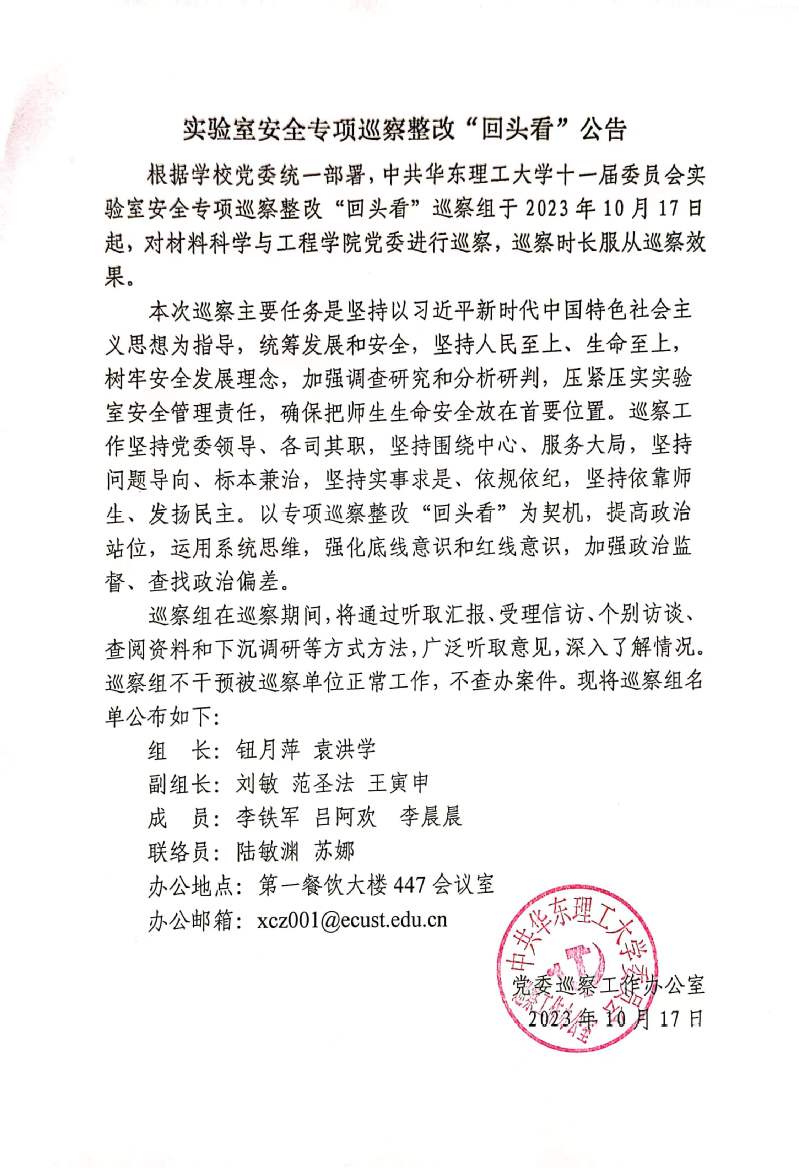 实验室安全专项巡察整改”回头看“公告