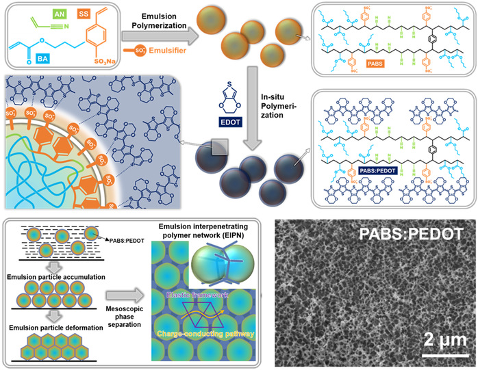 在这项工作中,通过分步乳液聚合,合成了一种由含磺酸盐的硬弹性共聚物核和聚(3,4-乙烯二氧噻吩)导电聚合物壳组成的水性导电粘结剂(PABS:PEDOT)。当该粘结剂干燥并触发乳胶颗粒融合时,基于内核组分和外壳组分间的静电作用以及各自链段的聚集特性,通过调控二次掺杂剂二甲基亚砜的引入,两者会发生介观相分离形成互穿网络。依靠源自内核的富含极性基团弹性骨架和源自外壳具有氧化还原介质功能的电荷传输通道的协同作用,赋予硫正极优异的倍率性能(4 C,817