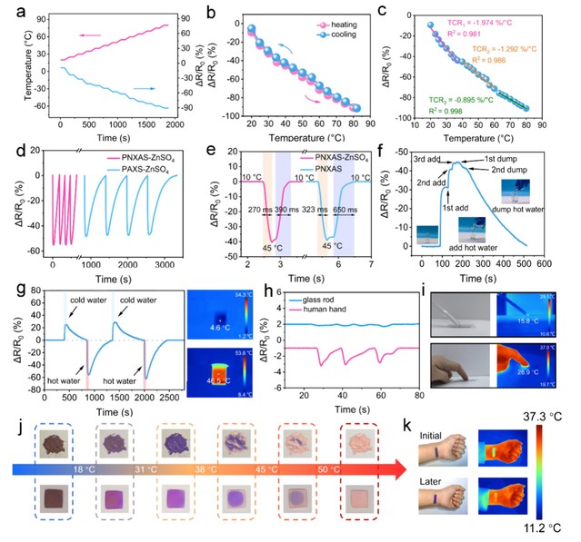 为此,提出可精确相变温度的片状硅酸镁锂掺杂的聚N-异丙基丙基酰胺水凝胶,模拟TRPV2热受体。制备的水凝胶表现出卓越的机械性能和强的附着力,断裂伸长率、杨氏模量、韧性和抗拉强度分别为1930%、5.91kPa、0.494 MJ/m3和34.2kPa。水凝胶中增强的离子纳米通道电导率和异构温度敏感单体能够以高灵敏度(GFmax =7.94)和快速响应(~87ms)进行应变感知。制备的热敏器件表现出TCRmax=-1.974%/(20-40℃)和270/390 ms(10-45℃)的温度响应/恢复时间,并通过引入温度变色材料实现视觉温度感知。在水凝胶中掺入ZnSO4作为离子导体,与MoS2纳米片构建了人工突触纤维,从而开发了一个仿生物感官突触神经形态系统,该系统能够通过突触信号进行实时应变/温度检测、识别和响应,并具有低能耗突触塑性性能(42.2fJ/spike)。因此,该工作为多模传感类人皮肤的应用提供了指导。