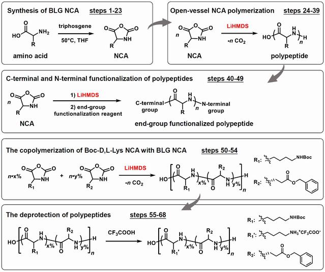 本研究中,研究团队系统地描述了NCA敞口快速开环聚合制备多肽聚合物的标准流程,涵盖单体合成及纯化、LiHMDS引发的聚合过程、末端官能团修饰、聚合动力学分析以及聚合物亚基分布测定等方法。该聚合方法极大地提高了多肽聚合物的合成效率,降低了合成技术门槛,助力非合成背景研究人员制备多肽聚合物,推动其在生物医药、组织工程及材料科学等多个领域的创新应用与发展,有望成为多肽聚合物类生物材料的标准合成方法。