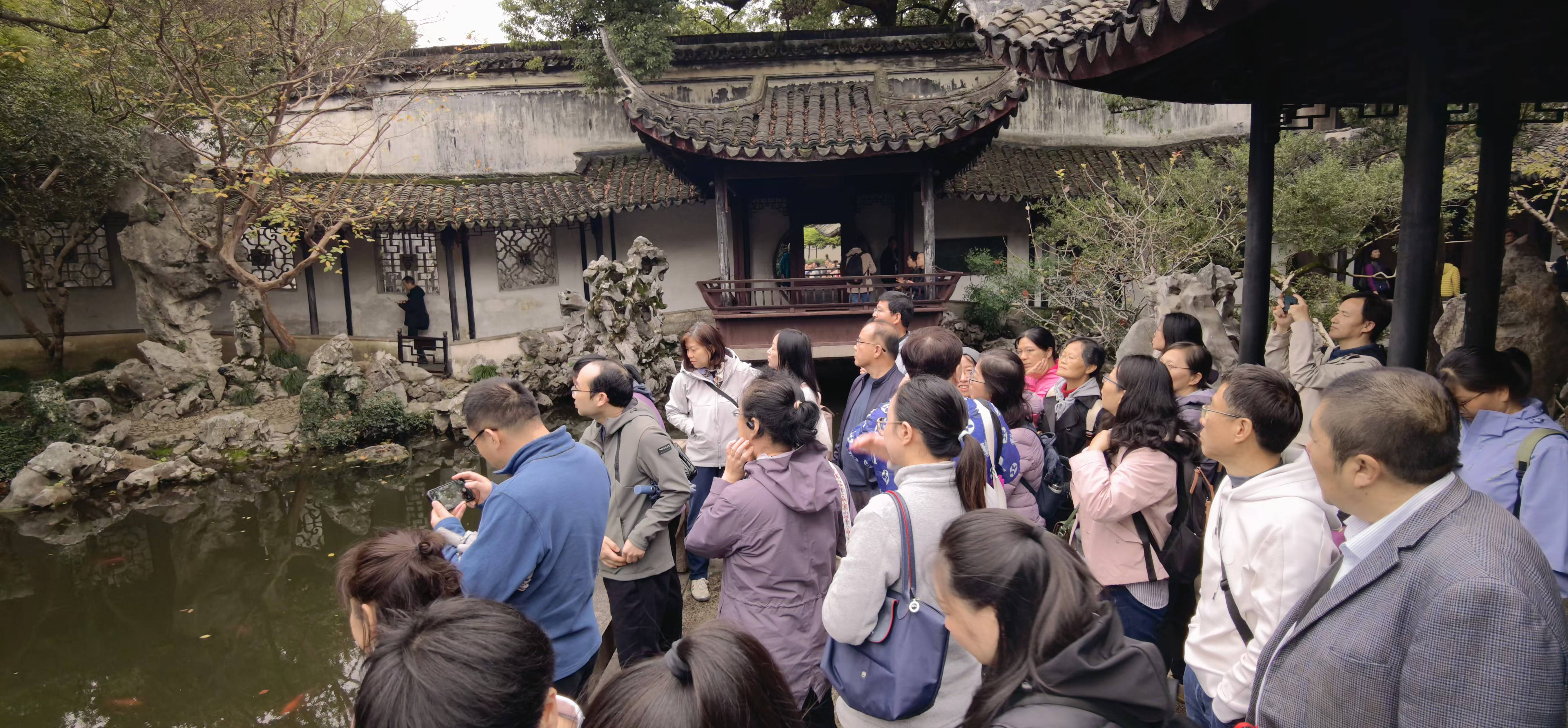 跨过小桥流水,穿过石街古巷,老师们先来到了退思园。这是由光绪年间代理按察使任兰生被罢官返回故里后花费10万两白银建造的一座小巧而精致的私家园林,园名来自《左传》中的“林父之事君也,进思尽忠,退思补过”之意,寓意反思自己的过去,修正错误。老师们穿厅过堂,在导游的讲解中细细品味中国古建筑的巧思和蕴涵的人文情感与礼仪文化,在亭台楼阁、廊桥水榭间徜徉,领悟园林小品、匾额对联和铺地花样中隐喻的人生哲理。