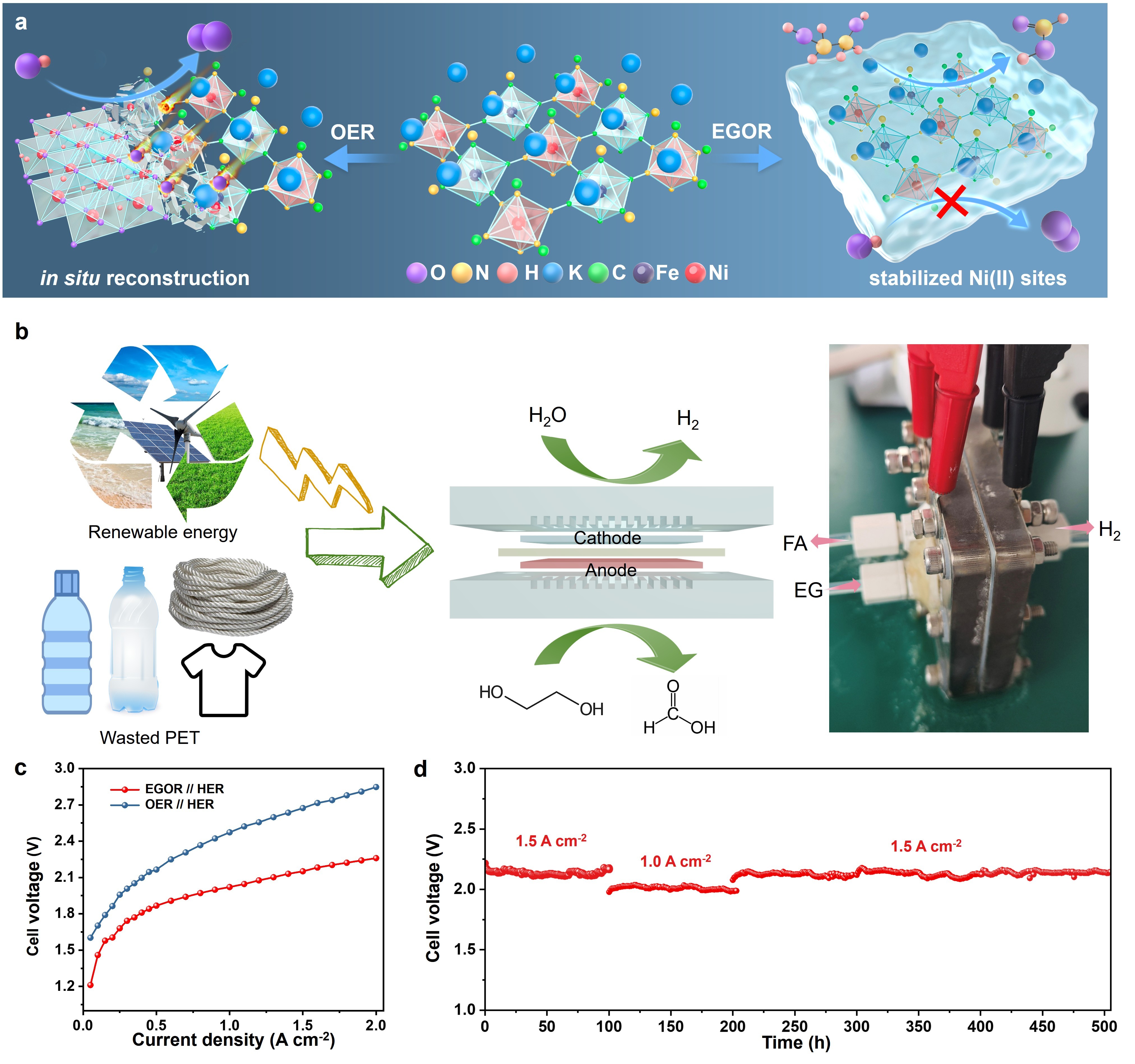 针对这一关键问题,我校材料科学与工程学院清洁能源材料与器件团队在普鲁士蓝类似物(NiFe-sc-PBA)体系中发现独特的低价Ni(II)活性位点,可以实现稳定、高效、高选择性的乙二醇氧化(EGOR)过程。系列原位/非原位表征结合理论计算证明了Ni(II)位点在EGOR反应过程中的稳定性,即无需重构形成高价NiOOH活性物质便可以发生高选择性EGOR催化过程。分子动力学模拟进一步表明了“催化剂-反应物相互作用关系”在醇类氧化中的重要性:EG分子倾向于聚集在NiFe-sc-PBA表面,重塑的氢键网络阻止电解质中羟基的吸附氧,从而有效避免碱性溶液中羟基诱导的结构重构。所设计的Ni(II)活性中心在EGOR反应中展现出了优异的催化活性,在500和1000 mA cm⁻2的电流密度下,EGOR电位仅为1.484和1.625 V。为了进一步探究催化剂的实际应用潜力,对催化剂进行了膜电极器件组装,EGOR//HER体系相比与OER//HER体系显著降低了输入电压,在宽运行电流密度范围内(0.2到1.8 A cm-2)实现高甲酸法拉第效率(>90%)。组装的耦合制氢系统在1.0或1.5 A cm-2的电流密度下稳定运行了500小时,没有出现明显的性能衰减。本研究工作不仅为催化剂/反应物界面相互作用提供了全新的理解,也为设计高效、稳定的有机亲核小分子电氧化催化材料提供了重要借鉴。