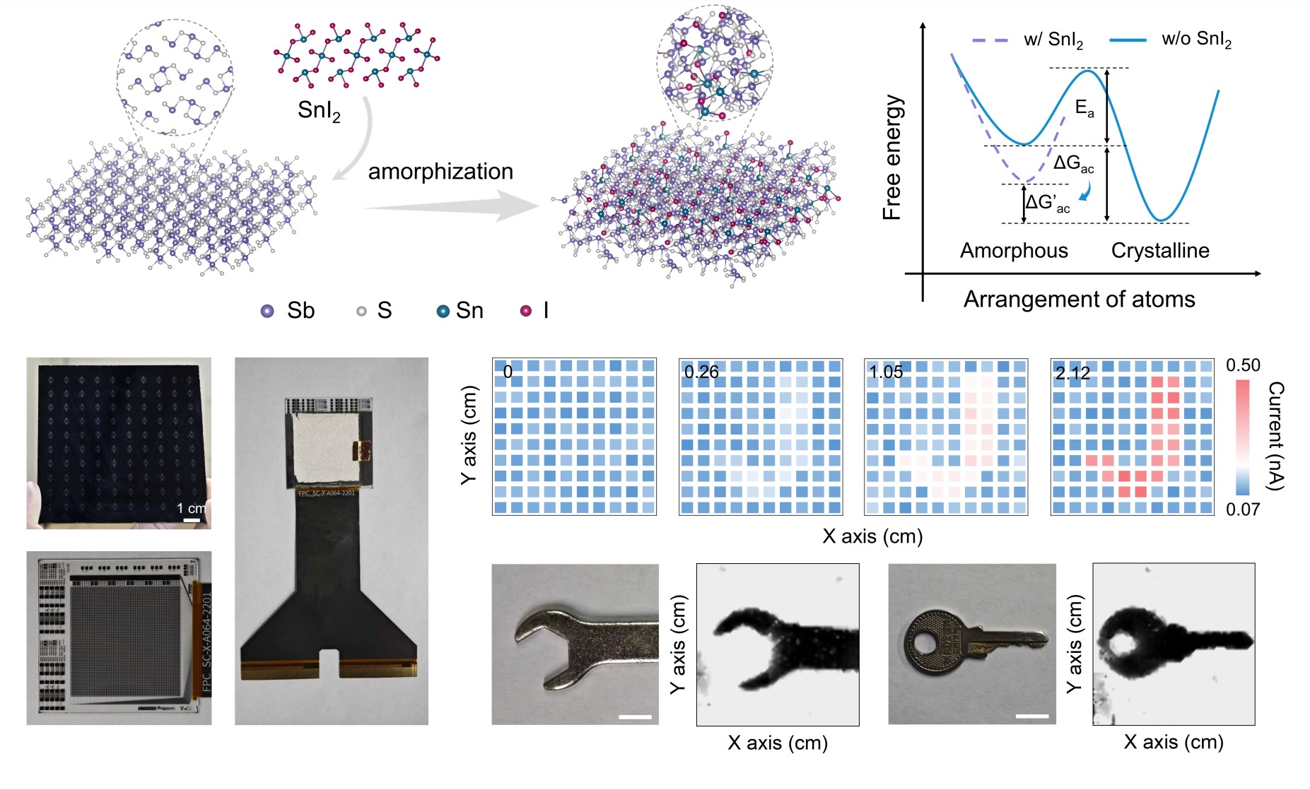 针对上述关键问题,研究团队通过异价掺杂方法,成功制备出具有高的相稳定性、强电荷收集能力和器件可拓展性的非晶硫化锑材料。理论和实验研究发现,异价金属卤化物的加入可改善Sb2S3链状结构并降低体系自由能,进而增强了其玻璃化能力。非晶Sb2S3具有窄带隙(1.66 eV)和高载流子寿命乘积(5.6×10-5 cm2 V-1)的优势,由其组装的X射线探测器在20 V mm-1电场下实现了4397 μC Gy-1 cm-2的探测灵敏度以及66 nGy s-1的最低检测限。另外,基于非晶Sb2S3薄膜的面积均匀性和高灵敏度特性,成功实现了在低剂量率(2.12 μGy s-1)下实时高分辨的X射线成像。