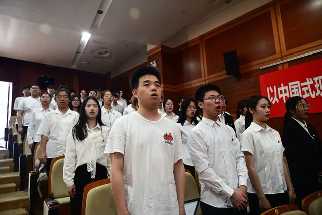 新团员入团仪式在庄严肃穆的氛围中举行。学生团委副书记陈百合宣读新发展团员名单,学生会执行主席王梓屹为新团员佩戴团徽。新团员面向团旗庄严宣誓,以铿锵誓言表达对共青团的忠诚及为共产主义事业奋斗的坚定信念。