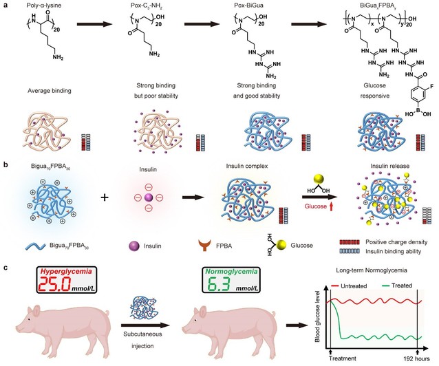 预计到2050年,糖尿病患者数量将达13.1亿,将成为全球导致死亡和残疾的主要原因之一。目前血糖管理主要依赖每日多次皮下注射胰岛素。然而,复杂的日常生理活动使血糖优化控制复杂化,限制了胰岛素调节血糖水平的疗效,此外反复皮下注射给患者带来沉重的治疗负担和压力。目前临床使用的多种长效胰岛素有望长期有效调控血糖水平并降低注射频率,但因其在餐后血糖负荷消退后仍持续发挥作用,潜在地增加了低血糖风险。针对以上挑战,该研究设计了一种兼具良好生物相容性和与胰岛素形成强相互作用正电荷聚噁唑啉聚合物,用于制备长效葡萄糖响应性胰岛素制剂。在聚合物中引入双胍基团取代伯胺基与胰岛素通过静电作用形成复合物,并通过氢键和盐桥双重作用与胰岛素形成更强相互作用,获得更高和更稳定的胰岛素负载能力,进一步在聚合物侧链修饰4-羧基-3-氟苯硼酸(FPBA)实现模拟β细胞功能的葡萄糖响应性胰岛素释放。在1型糖尿病小型猪模型中,单次皮下注射可维持糖尿病猪正常血糖超过192小时,且极少出现高血糖和低血糖事件。本研究为长效葡萄糖响应性胰岛素制剂的开发提供了新思路,为临床糖尿病人血糖临床管理提供了一种极具潜力的治疗选择。