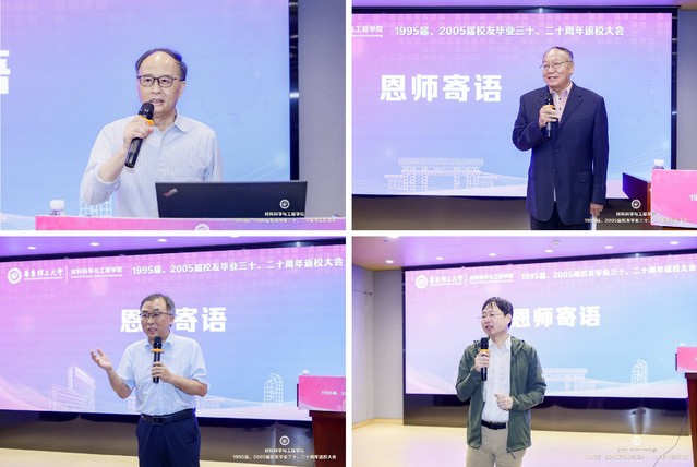 班导师和辅导员是陪伴学生成长的良师益友。恩师寄语环节,倪礼忠、朱源泰、周权、章圣苗4位老师分别回忆了和学生相处的时光,表达了与大家相聚的激动与喜悦。倪礼忠指出学院与学科近年来的发展成就,离不开材料专业在国民经济发展中的重要地位以及广大校友在业界良好的口碑以和长期的支持,当前材料领域仍面临许多挑战,期待校友与母校携手,共同解决技术难题,推进学科进步。朱源泰谈到,为校友们的成长和所获成就深感自豪,母校永远是学子们温暖的港湾,欢迎大家常回家看看。周权诚挚感谢校友们对学院发展的大力支持,特别是在专业建设、实习基地、推动产学研合作等方面积极为学院牵线搭桥,祝愿师生情、同窗谊历久弥新,地久天长。章圣苗表达了多年后重逢的喜悦,回忆起当年与校友们相处的生动情景,第一次开年级大会的场景,记忆犹新,希望校友们继续增进交流,共同为母校建设与行业发展贡献力量。